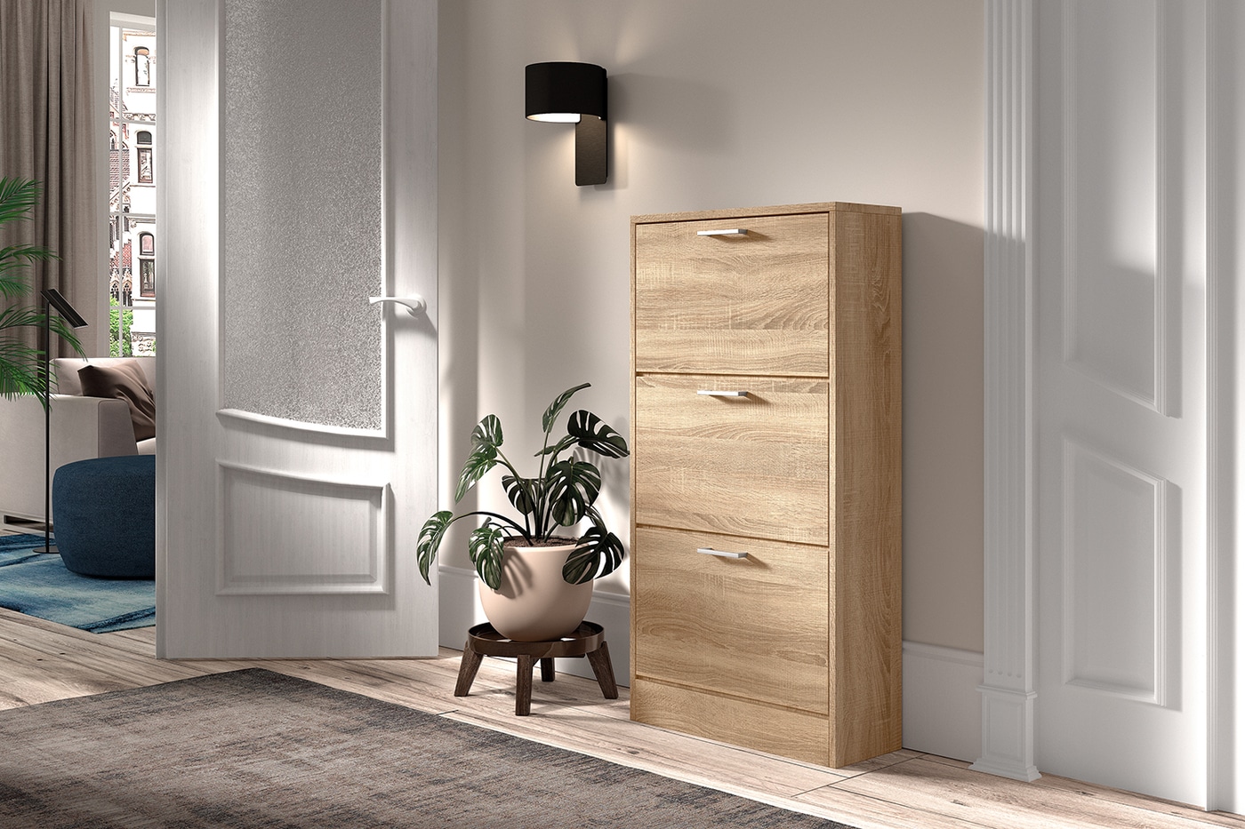 Kies voor een warme, natuurlijke look met de Carini schoenenkast in sonoma eik.