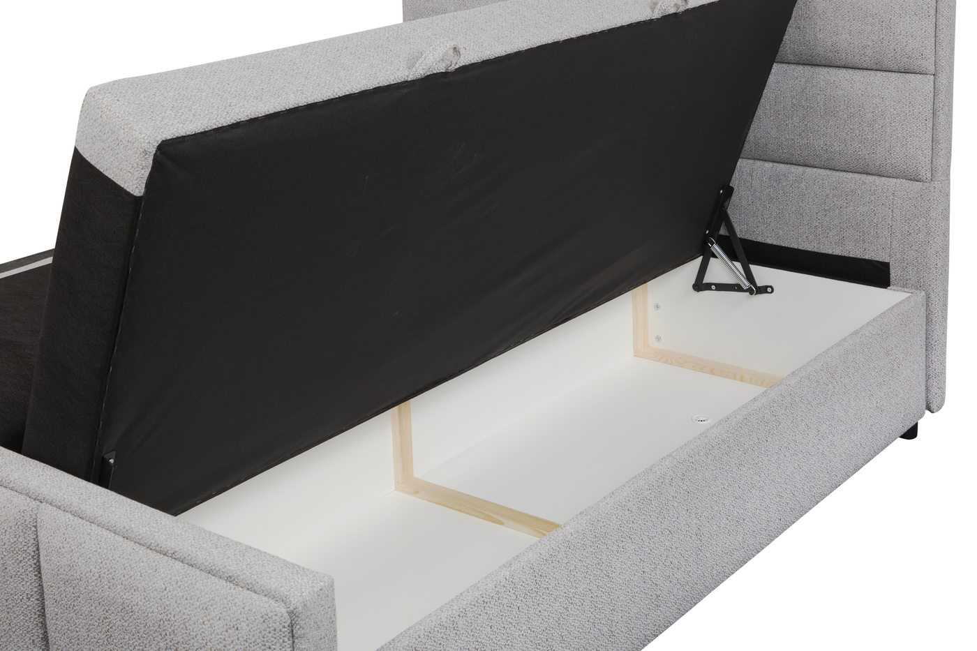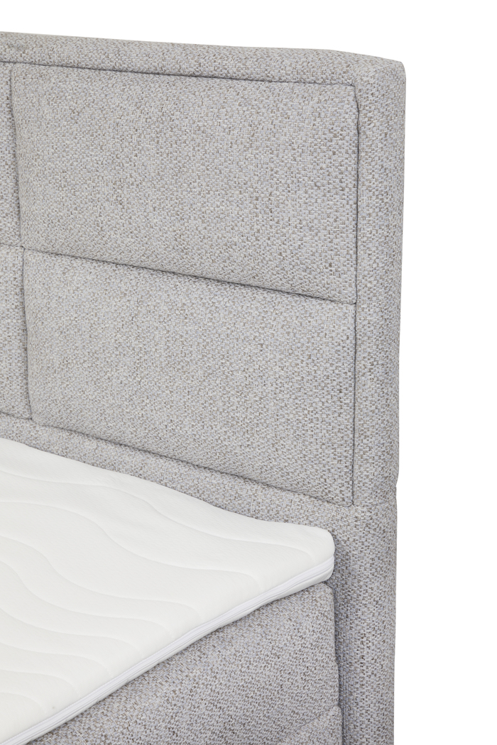 Deze stijlvolle boxspring in een moderne grijze stof biedt niet alleen een uitstekende nachtrust dankzij de inbegrepen toppermatras, maar ook verrassend veel opbergruimte onder het ligvlak.