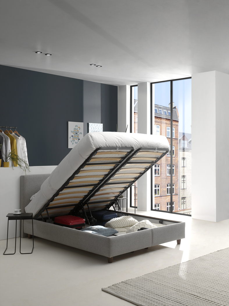 Deze king-size uitvoering beschikt over een bijzonder ruime opbergkoffer onder de lattenbodem, perfect voor grote dekens, kussens of koffers.