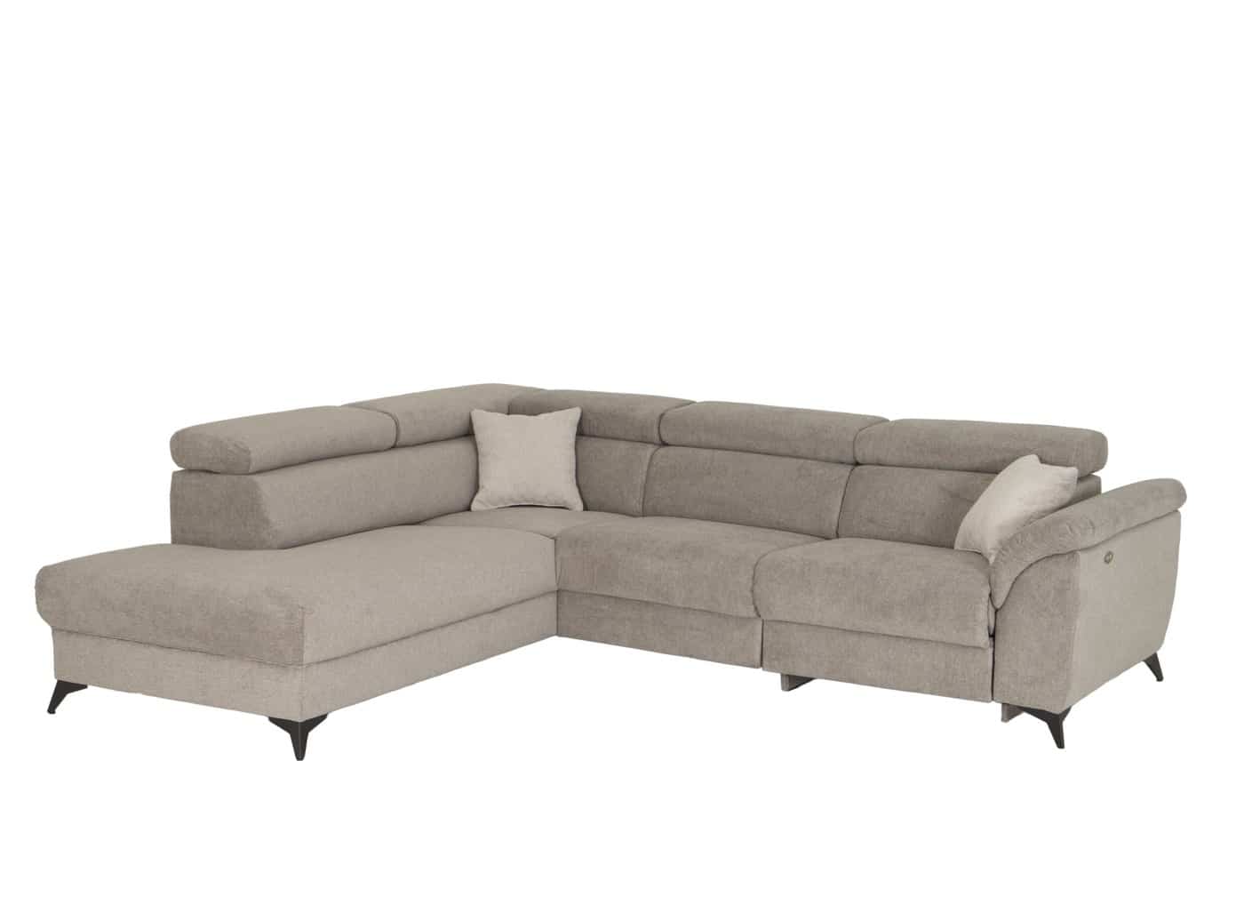 Ervaar ultiem zitcomfort met de salon Utah, een stijlvolle 3-zitsbank in een elegante grijs-beige stof, voorzien van een elektrische relaxfunctie en een ottomane aan de rechterzijde.