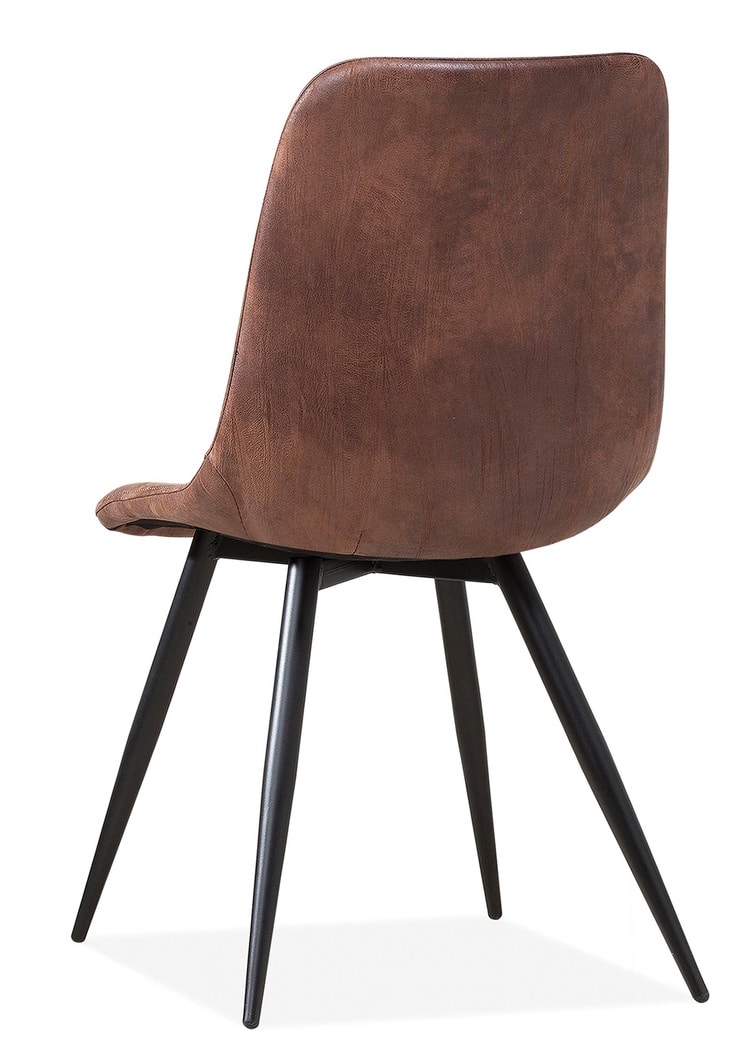 De zachte stof in een rijke cognackleur geeft de stoel een uitnodigende look, terwijl de zwarte metalen poten zorgen voor een stoer contrast.